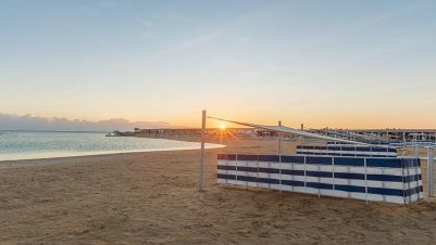 Собствен пясъчен плаж със залив и 3 плувни басейна, включително 1 за деца с чадъри, шезлонги с матраци, плажни огради за защита от вятъра, обслужване от бара, спасители на басейна и на плажа, кърпи за плажа и басейна, табели около басейна;