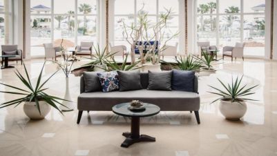 Джуниър суит с морски изглед: С площ 38 кв. м. и капацитет до 2 възрастни + 1 дете. Представлява едно помещение със спалня, просторен кът за сядане с диван, маса столове, и голяма тераса с гледка към морето.