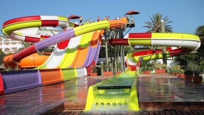 All Inclusive, няколко басейна, собствен аквапарк с водни пързалки, богата анимация, спортни терени и директен достъп до плажа. Хотелът е подходящ за семейства, особено с деца.
