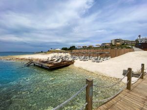 Плаж: собствен, пясъчно-чакълест плаж с дължина 150м и платформа.