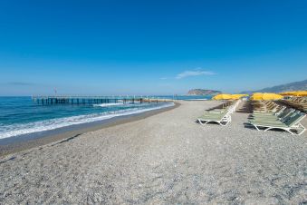 Собствен пясъчно-чакълест, чрез подлез. Плажни кърпи, чадъри, шезлонги на плажа и при басейна - безплатно, на кея - срещу доплащане.