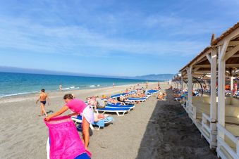 Собствен плаж, чакълест и платформа. Чадъри, шезлонги и матраци на плажа и при басейна- безплатно. Плажни кърпи - безплатно ( взимат се от турска баня 08:00-17:00)