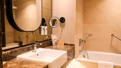 вана и душ,сешоар,везна,халат,чехли,централен климатик (Main building, регулира се от гостите на хотела),индивидуален климатик (villas,плазмен телевизор (може да се използва и като монитор за компютър – срещу допълнително заплащане),телефон,мини-бар (платено), сейф (в стаята, безплатно),под – паркет,балкон или тераса,почистване на стаите – ежедневно,смяна на спално бельо (по желание на гостите, ежедневно),room service (24 часа, платено),интернет (безжичен, кабелен, безплатно).