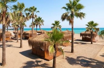 Собствен, пясъчен с малки камъчета (през река). Чадъри, шезлонги, матраци и плажни кърпи на плажа и при басейна - безплатно.