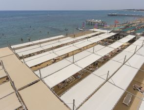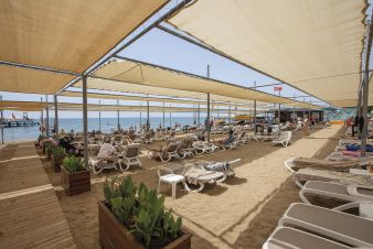 На 300 м. от плажа, пясъчно -чакълест. Чадъри, шезлонги и плажни кърпи на плажа и при басейна - безплатно.