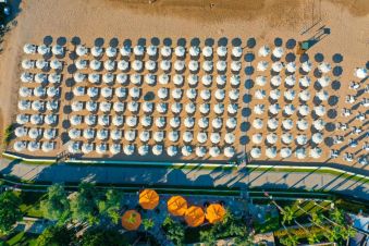 Собствен, пясъчно – чакълест, с дължина на плажната ивица 85 м. Чадъри, шезлонги и плажни кърпи на плажа и при басейна - безплатно.