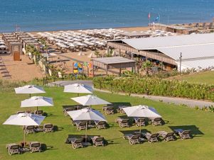 Собствен, пясъчен с дължина 450 м. Чадъри, шезлонги, матраци и плажни кърпи на плажа и при басейна - безплатно.